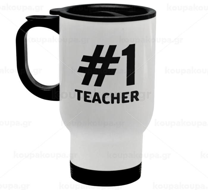 #1 teacher, Κούπα ταξιδιού ανοξείδωτη με καπάκι, διπλού τοιχώματος (θερμό) λευκή 450ml