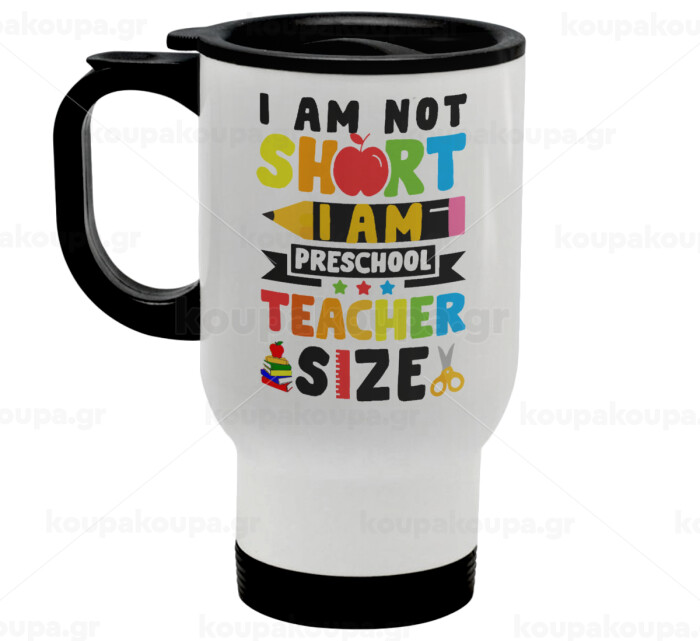 I Am Not Short I Am Preschool Teacher Size, Κούπα ταξιδιού ανοξείδωτη με καπάκι, διπλού τοιχώματος (θερμό) λευκή 450ml