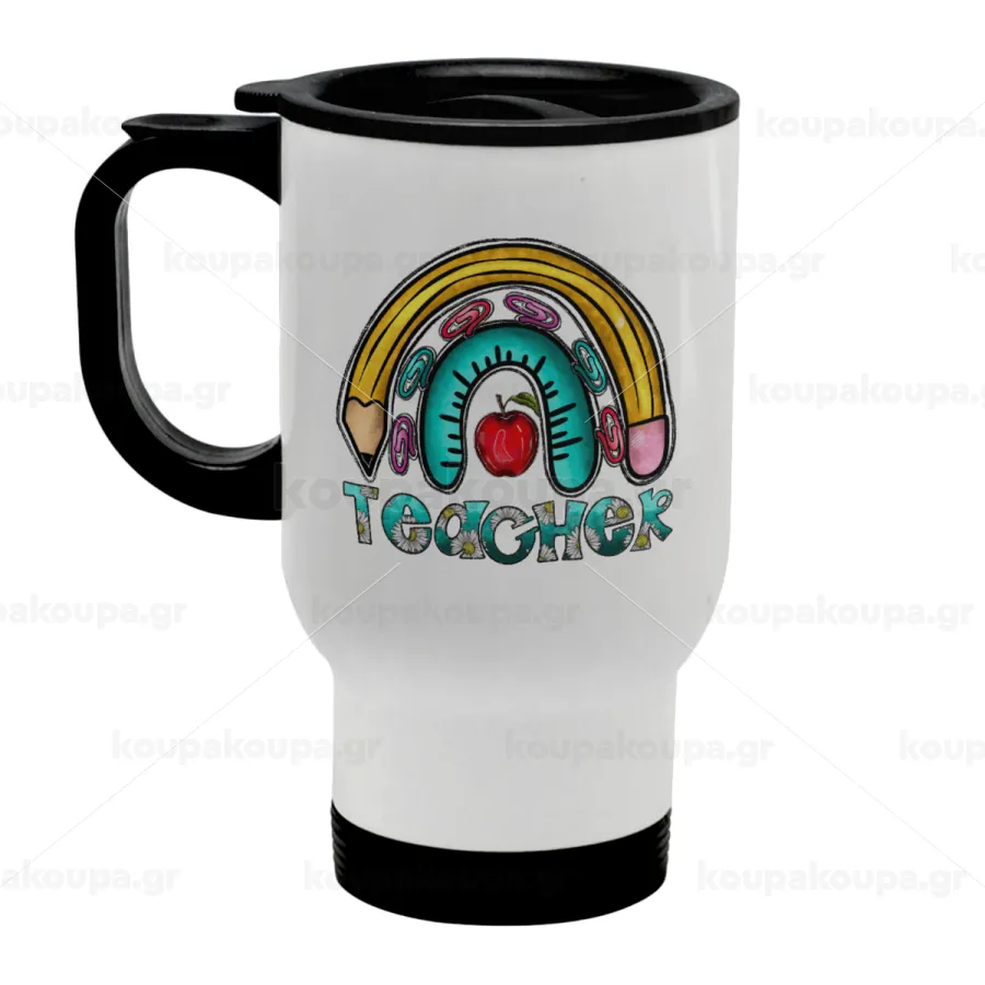 Teacher, Κούπα ταξιδιού ανοξείδωτη με καπάκι, διπλού τοιχώματος (θερμό) λευκή 450ml