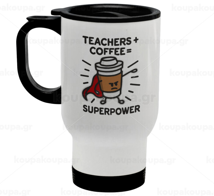 Teacher Coffee Super Power, Κούπα ταξιδιού ανοξείδωτη με καπάκι, διπλού τοιχώματος (θερμό) λευκή 450ml