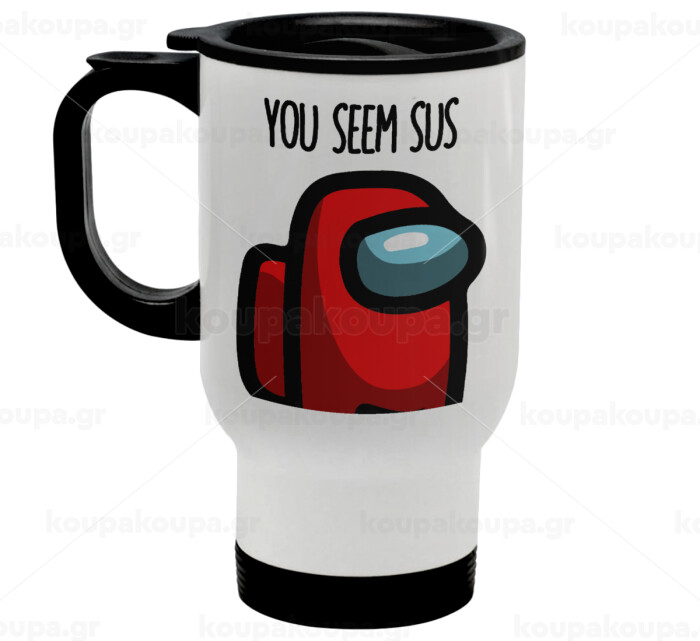 Among US, you seem sus, Κούπα ταξιδιού ανοξείδωτη με καπάκι, διπλού τοιχώματος (θερμό) λευκή 450ml