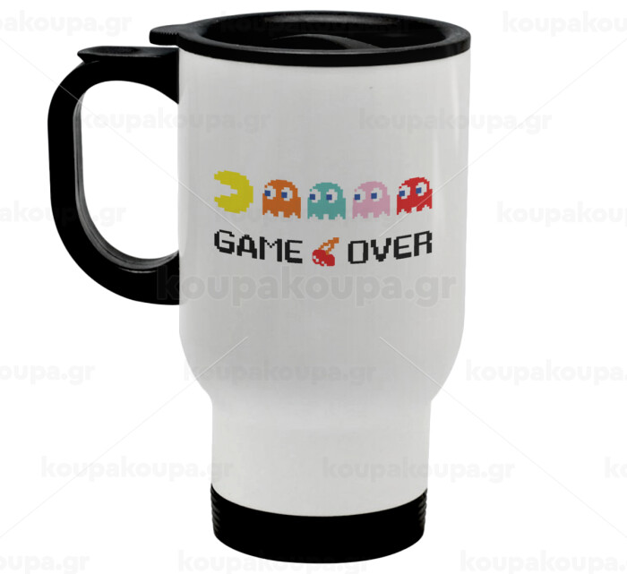 GAME OVER pac-man, Κούπα ταξιδιού ανοξείδωτη με καπάκι, διπλού τοιχώματος (θερμό) λευκή 450ml