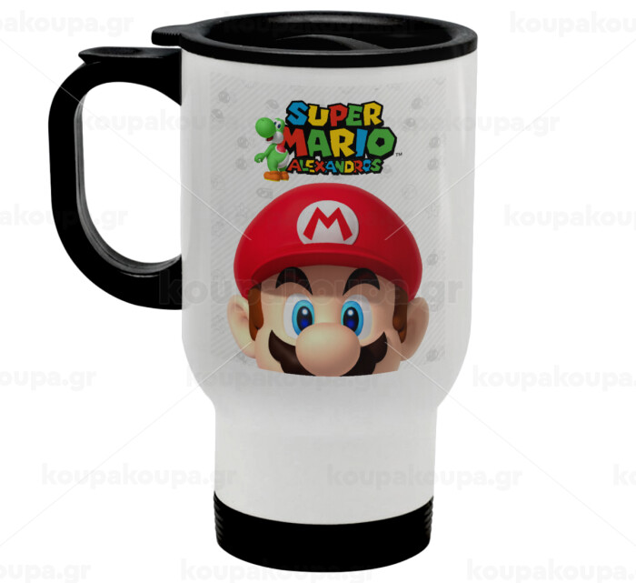 Super mario head, Κούπα ταξιδιού ανοξείδωτη με καπάκι, διπλού τοιχώματος (θερμό) λευκή 450ml