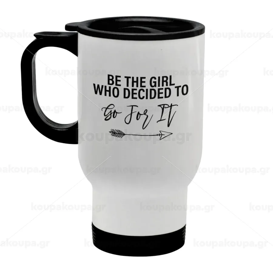 Be the girl who decided to, Κούπα ταξιδιού ανοξείδωτη με καπάκι, διπλού τοιχώματος (θερμό) λευκή 450ml