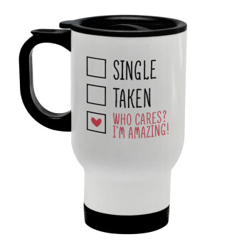 Single, Taken, Who cares i'm amazing, Κούπα ταξιδιού ανοξείδωτη με καπάκι, διπλού τοιχώματος (θερμό) λευκή 450ml