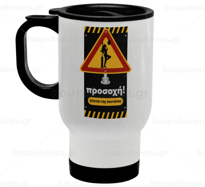 Προσοχή Γίνεται της πουτ.νας, Κούπα ταξιδιού ανοξείδωτη με καπάκι, διπλού τοιχώματος (θερμό) λευκή 450ml