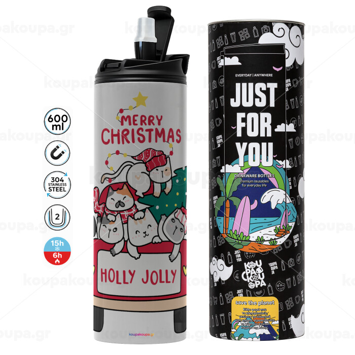 Merry Christmas cats in car, Tumbler ποτήρι θερμό ΓΚΡΙ από ανοξείδωτο ατσάλι 600ml