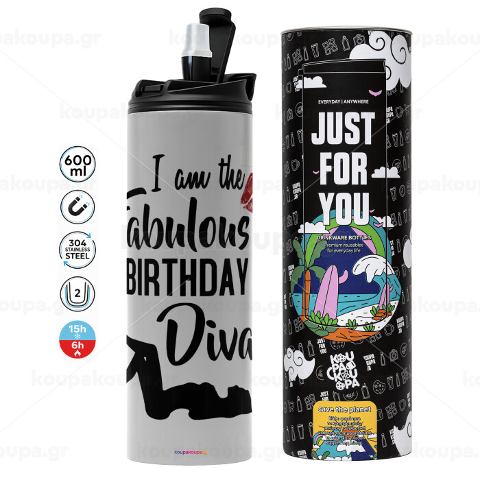 I am the fabulous Birthday Diva, Tumbler ποτήρι θερμό ΓΚΡΙ από ανοξείδωτο ατσάλι 600ml