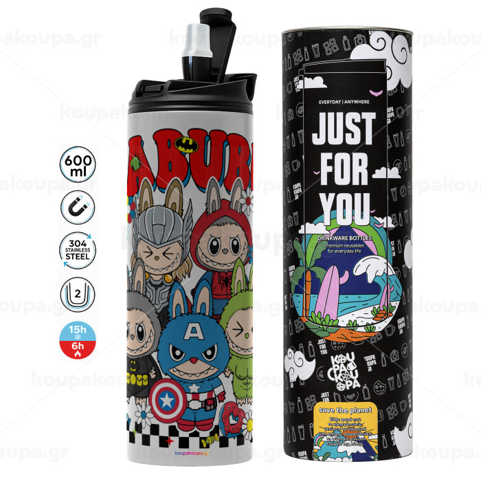 Labubu superheroes, Tumbler ποτήρι θερμό ΓΚΡΙ από ανοξείδωτο ατσάλι 600ml
