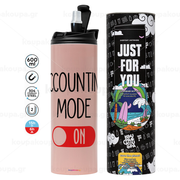 ACCOUNTANT MODE ON, Tumbler ποτήρι θερμό ΡΟΖ από ανοξείδωτο ατσάλι 600ml