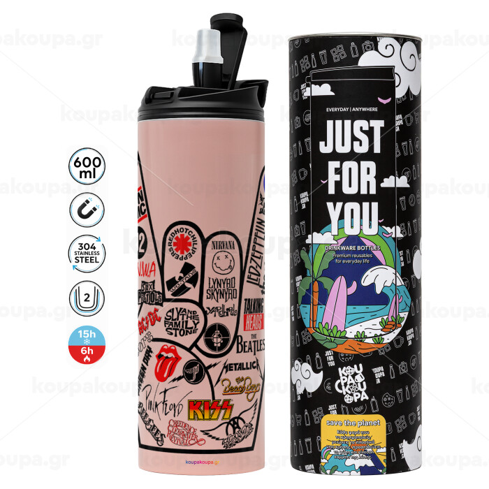 Best Rock Bands hand, Tumbler ποτήρι θερμό ΡΟΖ από ανοξείδωτο ατσάλι 600ml