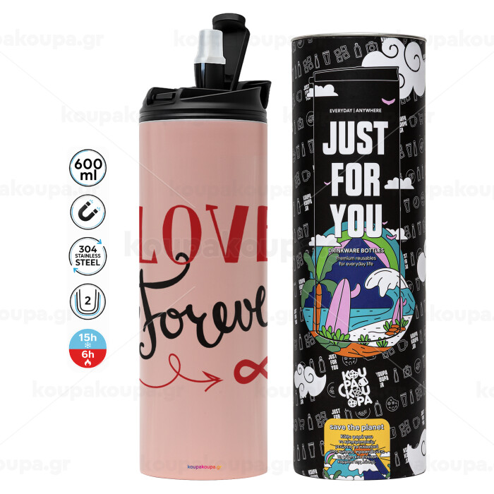 Love forever ∞, Tumbler ποτήρι θερμό ΡΟΖ από ανοξείδωτο ατσάλι 600ml