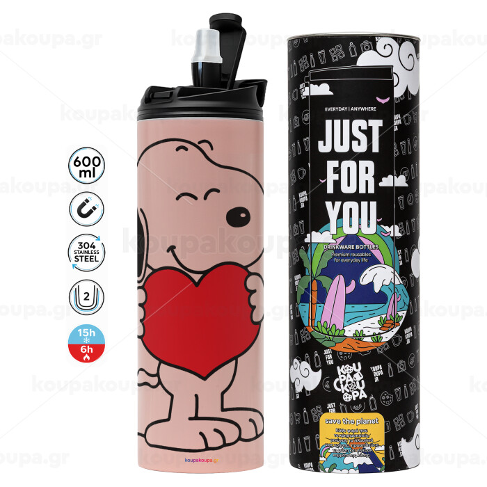 Snoopy takemy heart, Tumbler ποτήρι θερμό ΡΟΖ από ανοξείδωτο ατσάλι 600ml