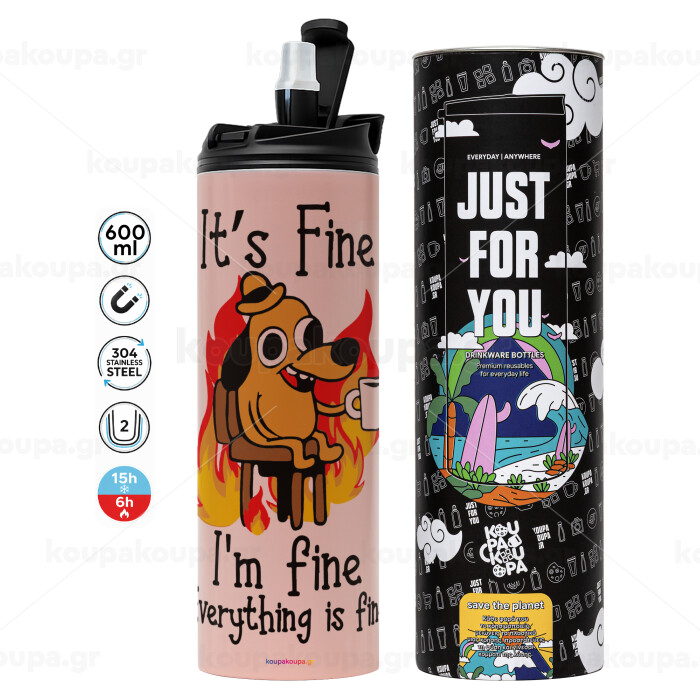It's Fine I'm Fine Everything Is Fine, Tumbler ποτήρι θερμό ΡΟΖ από ανοξείδωτο ατσάλι 600ml