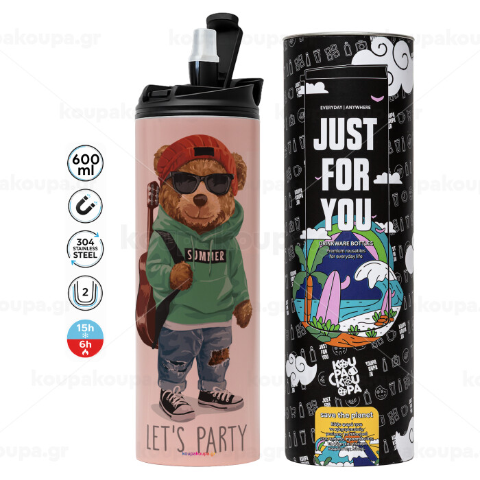 Let's Party Bear, Tumbler ποτήρι θερμό ΡΟΖ από ανοξείδωτο ατσάλι 600ml