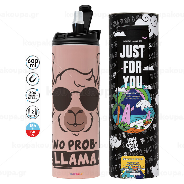 No Prob Llama, Tumbler ποτήρι θερμό ΡΟΖ από ανοξείδωτο ατσάλι 600ml