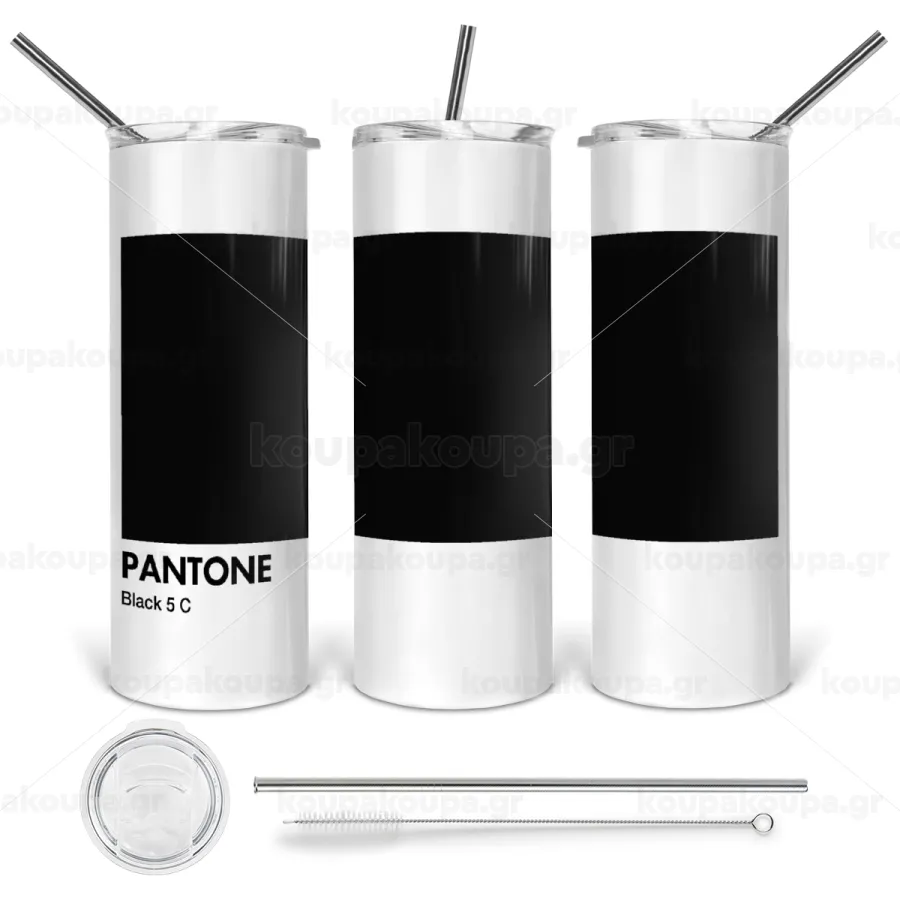 Pantone Black, Tumbler ποτήρι θερμό από ανοξείδωτο ατσάλι 600ml, με μεταλλικό καλαμάκι & βούρτσα καθαρισμού