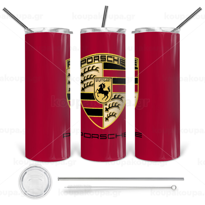 Porsche, Tumbler ποτήρι θερμό από ανοξείδωτο ατσάλι 600ml, με μεταλλικό καλαμάκι & βούρτσα καθαρισμού