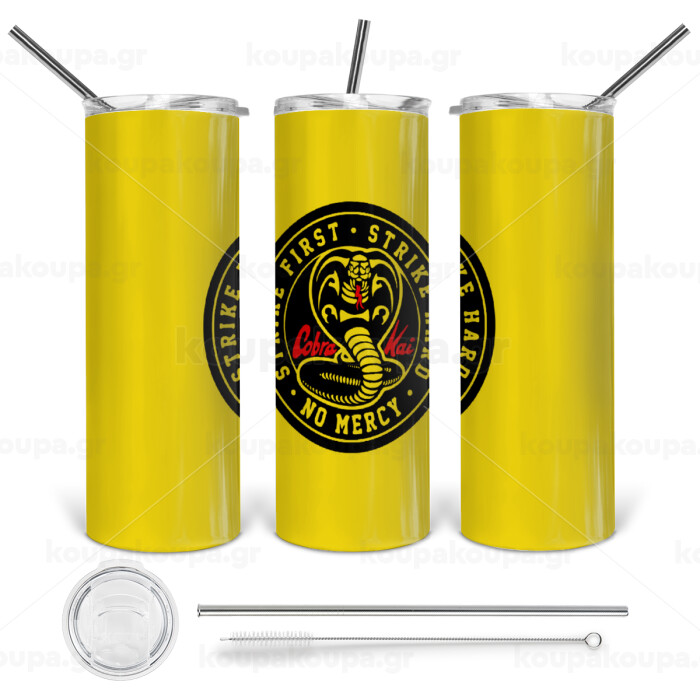 cobra kai strike first dojo, Tumbler ποτήρι θερμό από ανοξείδωτο ατσάλι 600ml, με μεταλλικό καλαμάκι & βούρτσα καθαρισμού