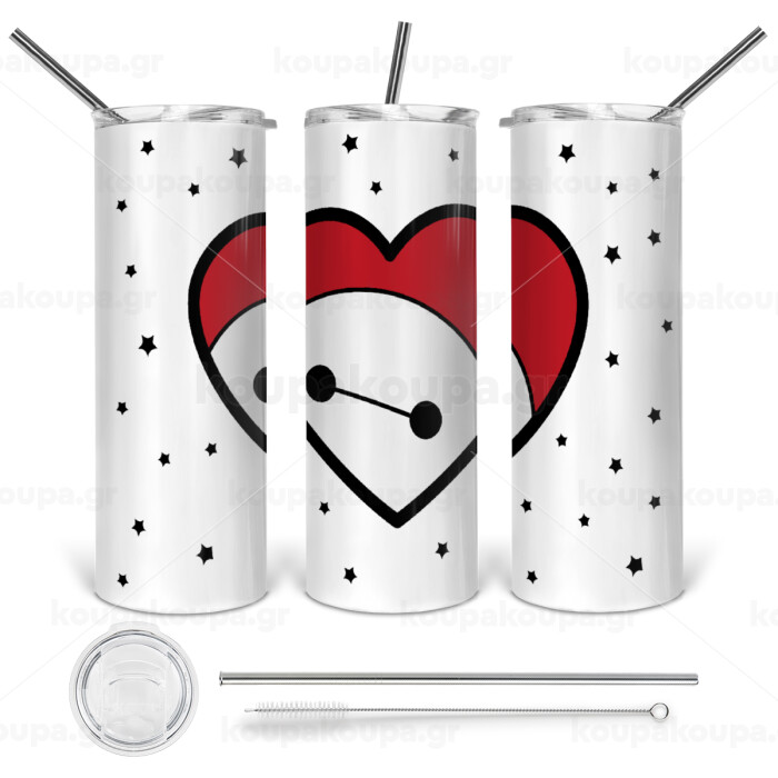 Baymax heart, Tumbler ποτήρι θερμό από ανοξείδωτο ατσάλι 600ml, με μεταλλικό καλαμάκι & βούρτσα καθαρισμού