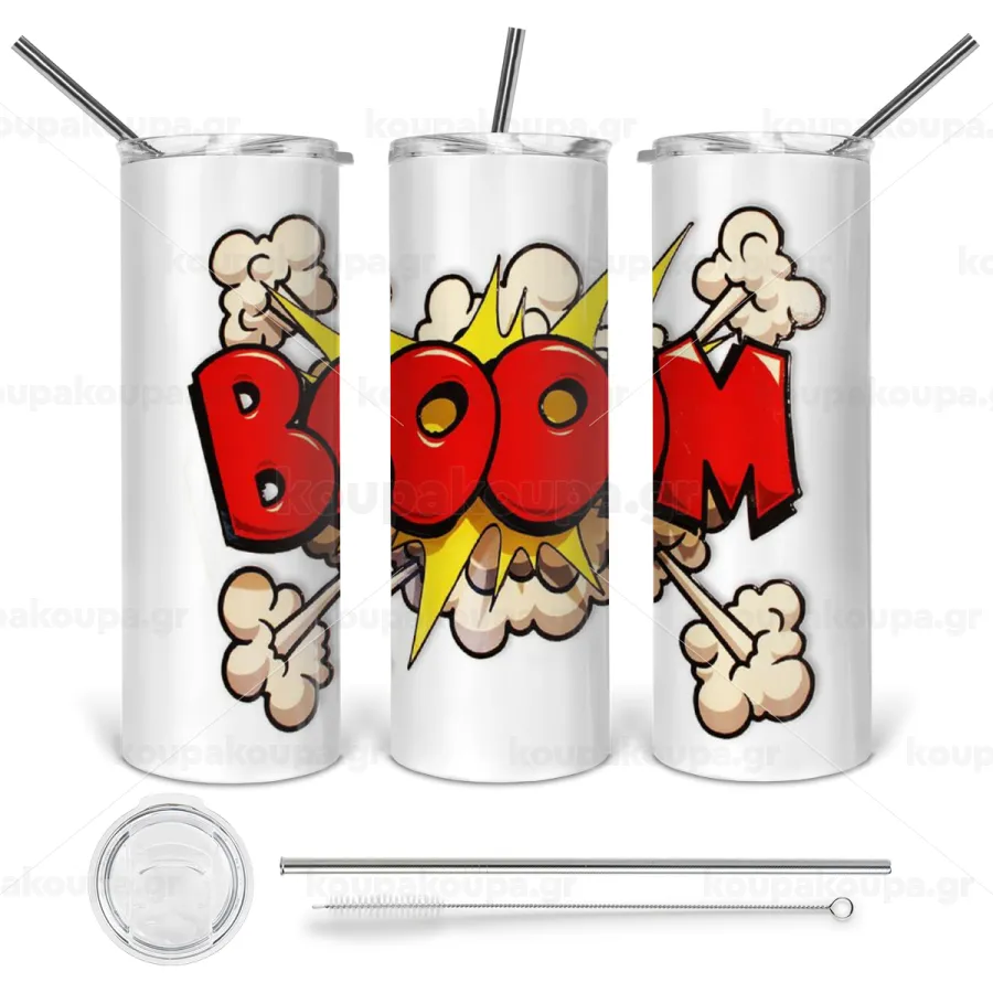 BOOM!!!, Tumbler ποτήρι θερμό από ανοξείδωτο ατσάλι 600ml, με μεταλλικό καλαμάκι & βούρτσα καθαρισμού