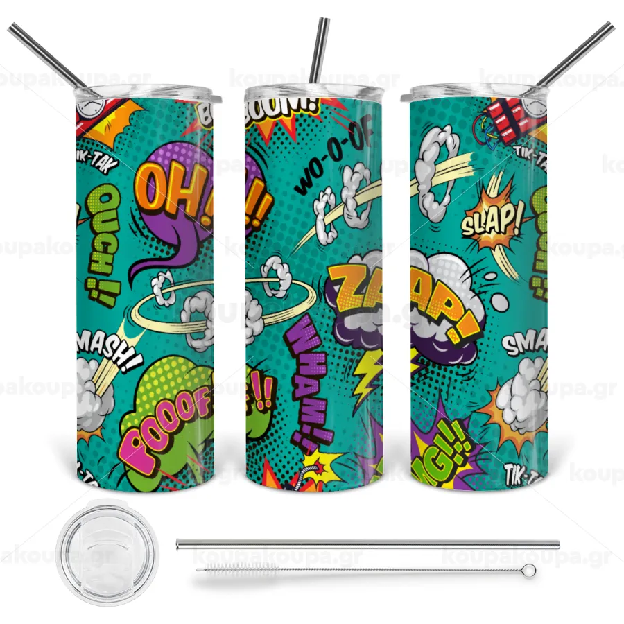 Comic oh, Tumbler ποτήρι θερμό από ανοξείδωτο ατσάλι 600ml, με μεταλλικό καλαμάκι & βούρτσα καθαρισμού