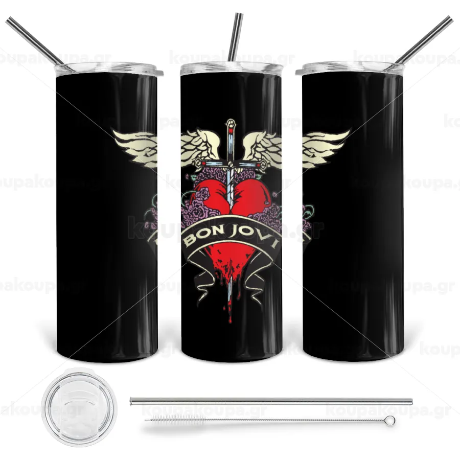 Bon Jovi, Tumbler ποτήρι θερμό από ανοξείδωτο ατσάλι 600ml, με μεταλλικό καλαμάκι & βούρτσα καθαρισμού
