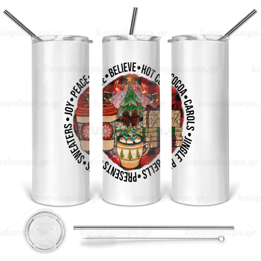 Joy, Peace, Believe, Hot Cocoa, Carols, Tumbler ποτήρι θερμό από ανοξείδωτο ατσάλι 600ml, με μεταλλικό καλαμάκι & βούρτσα καθαρισμού