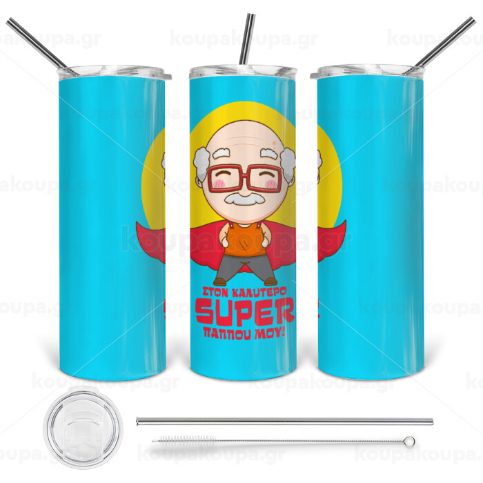 Στον καλύτερο Super παππού μου!, Tumbler ποτήρι θερμό από ανοξείδωτο ατσάλι 600ml, με μεταλλικό καλαμάκι & βούρτσα καθαρισμού