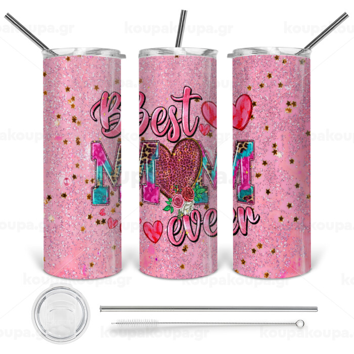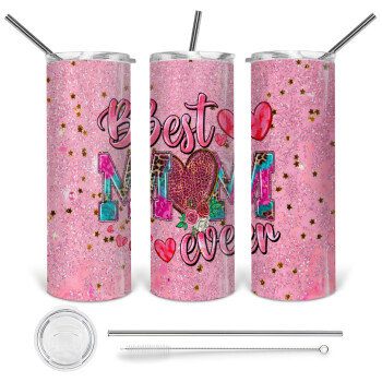 Best mom ever Mother's Day pink, Tumbler ποτήρι θερμό από ανοξείδωτο ατσάλι 600ml, με μεταλλικό καλαμάκι & βούρτσα καθαρισμού