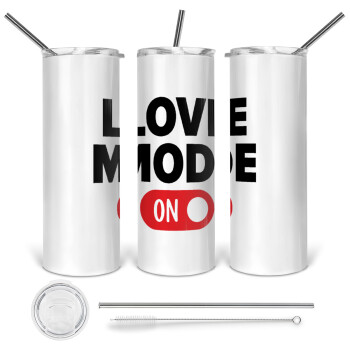 LOVE MODE ON, Tumbler ποτήρι θερμό από ανοξείδωτο ατσάλι 600ml, με μεταλλικό καλαμάκι & βούρτσα καθαρισμού