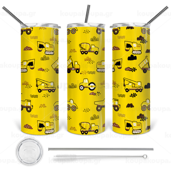 Αμαξάκια φορτωτές και μπουλντόζες, Tumbler ποτήρι θερμό από ανοξείδωτο ατσάλι 600ml, με μεταλλικό καλαμάκι & βούρτσα καθαρισμού