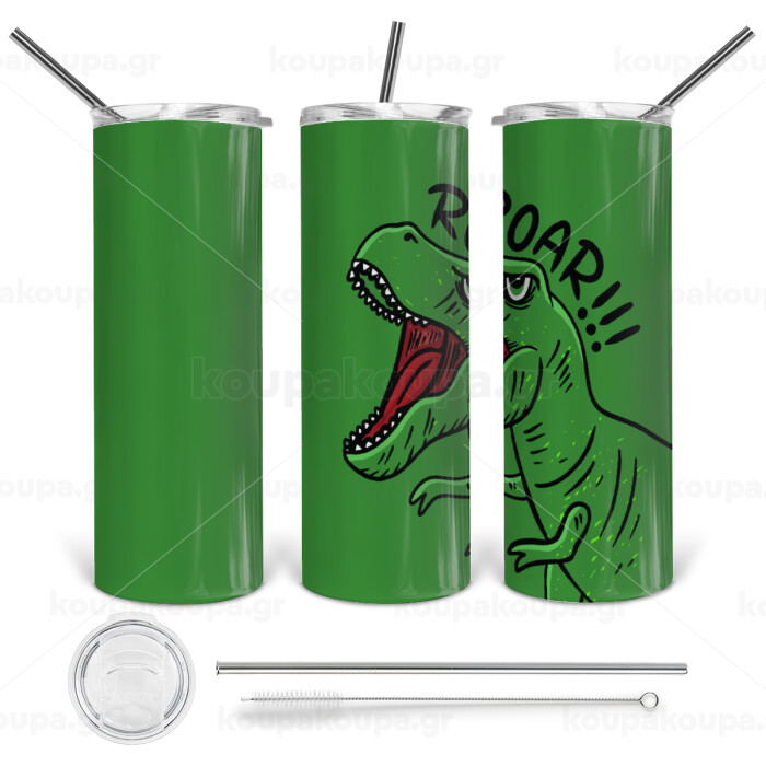 Dyno roar!!!, Tumbler ποτήρι θερμό από ανοξείδωτο ατσάλι 600ml, με μεταλλικό καλαμάκι & βούρτσα καθαρισμού