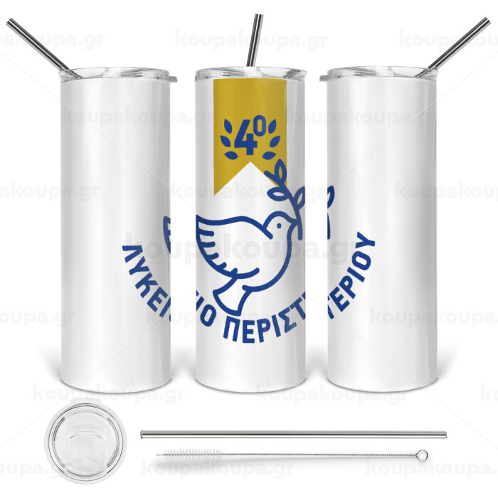 Έμβλημα Σχολικό μπλε/χρυσό περιστέρι, Tumbler ποτήρι θερμό από ανοξείδωτο ατσάλι 600ml, με μεταλλικό καλαμάκι & βούρτσα καθαρισμού