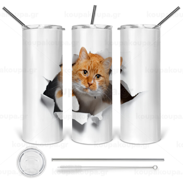Cat cracked, Tumbler ποτήρι θερμό από ανοξείδωτο ατσάλι 600ml, με μεταλλικό καλαμάκι & βούρτσα καθαρισμού