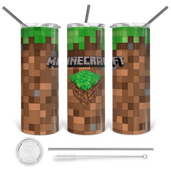 Minecraft dirt, Tumbler ποτήρι θερμό από ανοξείδωτο ατσάλι 600ml, με μεταλλικό καλαμάκι & βούρτσα καθαρισμού