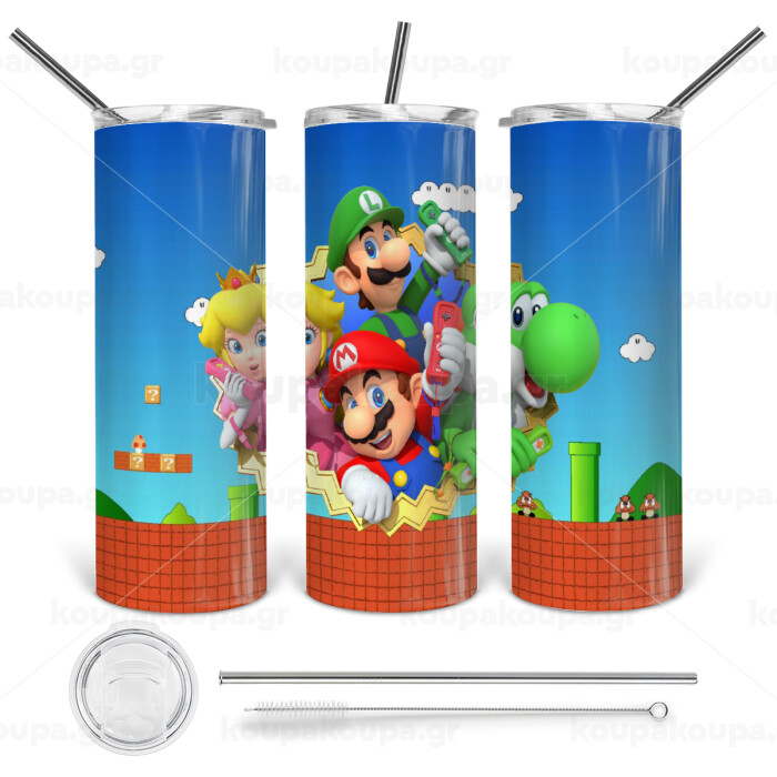 Super mario and Friends, Tumbler ποτήρι θερμό από ανοξείδωτο ατσάλι 600ml, με μεταλλικό καλαμάκι & βούρτσα καθαρισμού