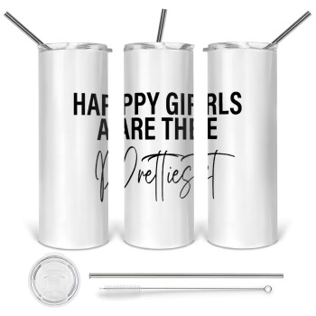 Happy girls are the prettiest, Tumbler ποτήρι θερμό από ανοξείδωτο ατσάλι 600ml, με μεταλλικό καλαμάκι & βούρτσα καθαρισμού