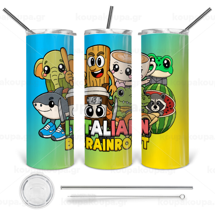 Italian Brainrot friends, Tumbler ποτήρι θερμό από ανοξείδωτο ατσάλι 600ml, με μεταλλικό καλαμάκι & βούρτσα καθαρισμού