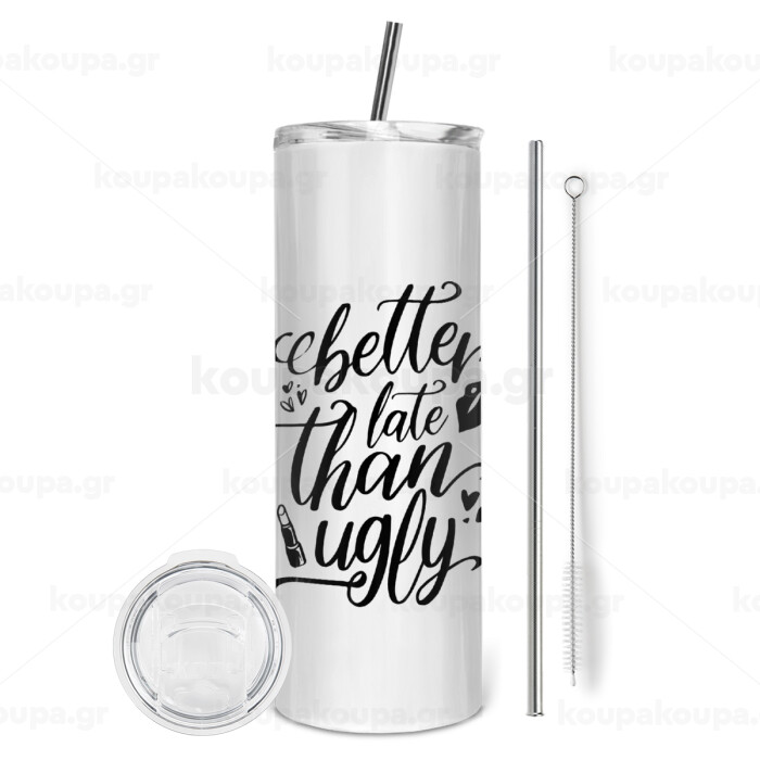 Better late than ugly, Tumbler ποτήρι θερμό από ανοξείδωτο ατσάλι 600ml, με μεταλλικό καλαμάκι & βούρτσα καθαρισμού
