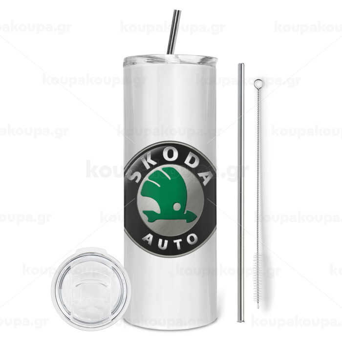 SKODA, Tumbler ποτήρι θερμό από ανοξείδωτο ατσάλι 600ml, με μεταλλικό καλαμάκι & βούρτσα καθαρισμού