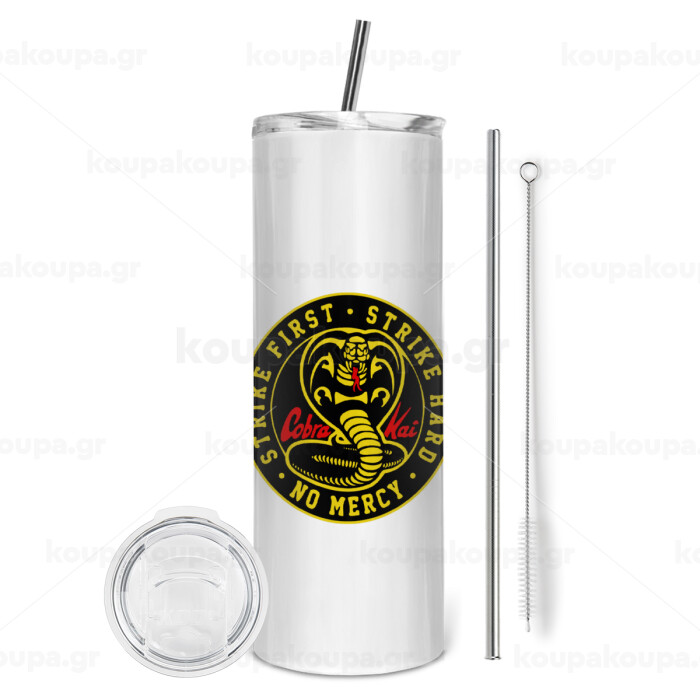 cobra kai strike first dojo, Tumbler ποτήρι θερμό από ανοξείδωτο ατσάλι 600ml, με μεταλλικό καλαμάκι & βούρτσα καθαρισμού