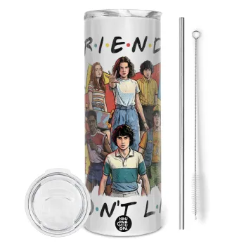 Friends Dont Lie, Stranger Things, Tumbler ποτήρι θερμό από ανοξείδωτο ατσάλι 600ml, με μεταλλικό καλαμάκι & βούρτσα καθαρισμού