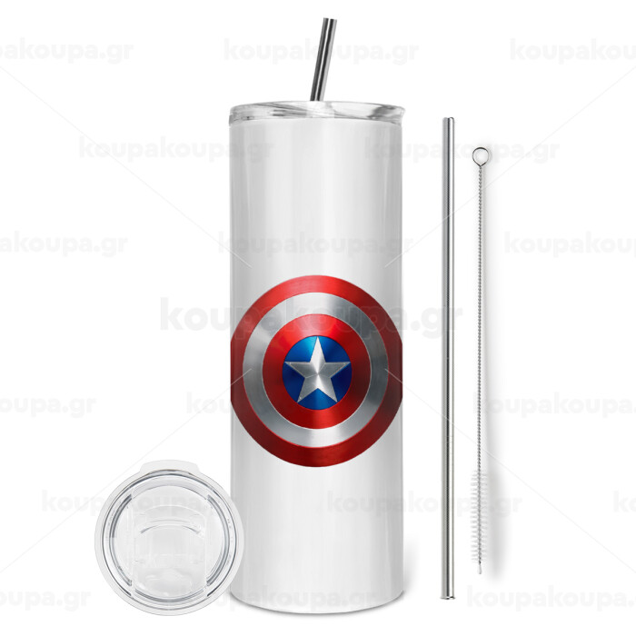 Captain America, Tumbler ποτήρι θερμό από ανοξείδωτο ατσάλι 600ml, με μεταλλικό καλαμάκι & βούρτσα καθαρισμού