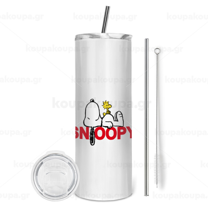 Snoopy sleep, Tumbler ποτήρι θερμό από ανοξείδωτο ατσάλι 600ml, με μεταλλικό καλαμάκι & βούρτσα καθαρισμού