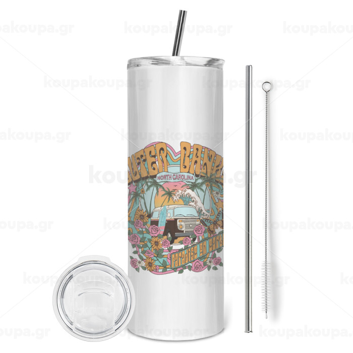 Outerbanks paradise on earth, Tumbler ποτήρι θερμό από ανοξείδωτο ατσάλι 600ml, με μεταλλικό καλαμάκι & βούρτσα καθαρισμού