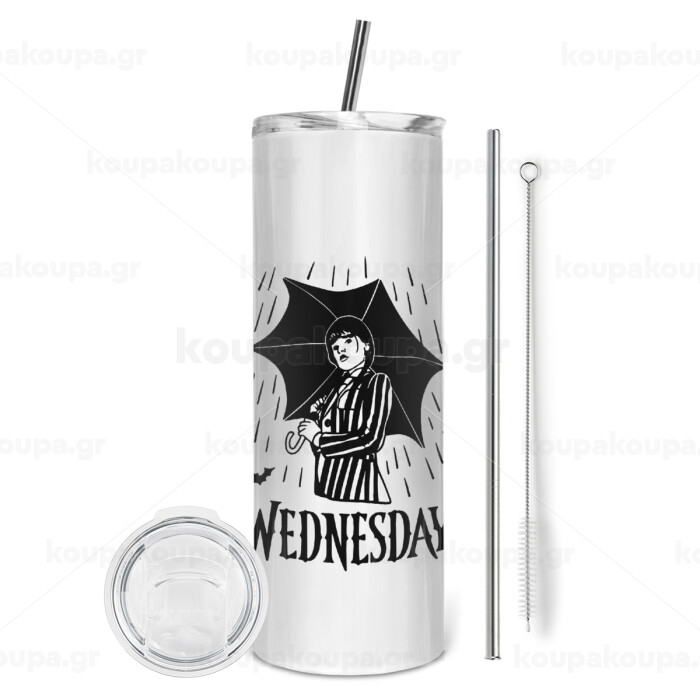Wednesday Addams, Tumbler ποτήρι θερμό από ανοξείδωτο ατσάλι 600ml, με μεταλλικό καλαμάκι & βούρτσα καθαρισμού