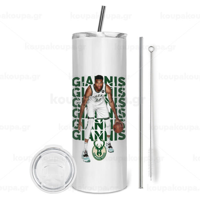 Γιάννης Αντετοκούνμπο, Tumbler ποτήρι θερμό από ανοξείδωτο ατσάλι 600ml, με μεταλλικό καλαμάκι & βούρτσα καθαρισμού