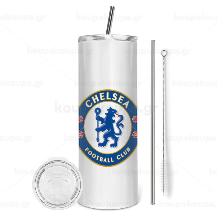 FC Chelsea, Tumbler ποτήρι θερμό από ανοξείδωτο ατσάλι 600ml, με μεταλλικό καλαμάκι & βούρτσα καθαρισμού