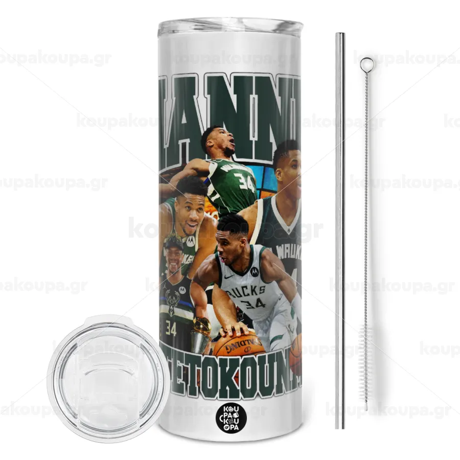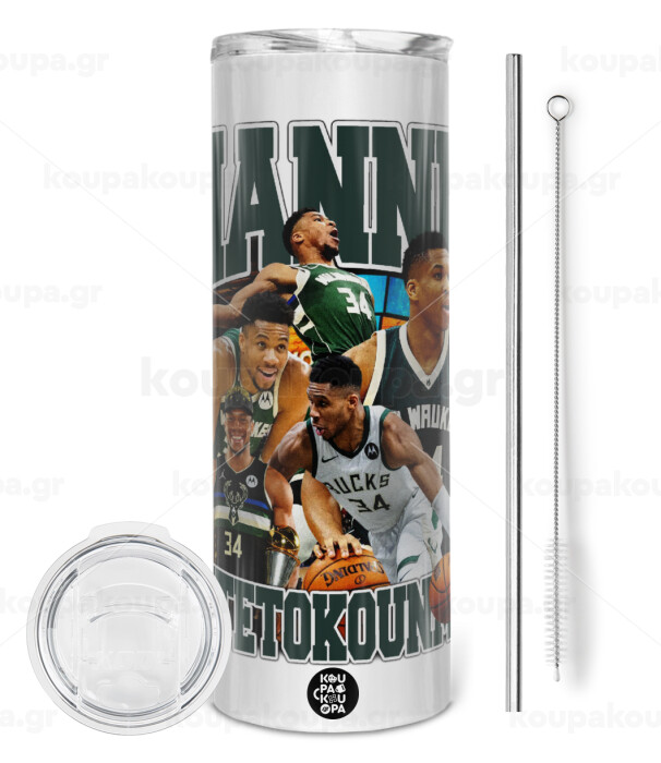 Giannis Antetokounmpo, Tumbler ποτήρι θερμό από ανοξείδωτο ατσάλι 600ml, με μεταλλικό καλαμάκι & βούρτσα καθαρισμού